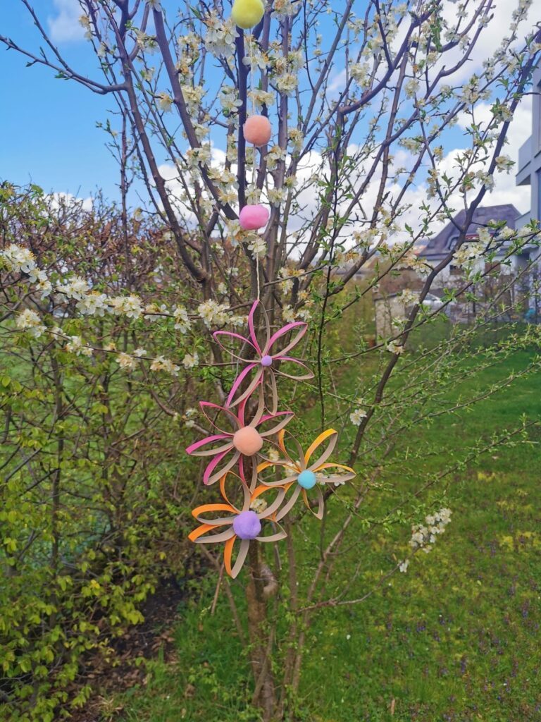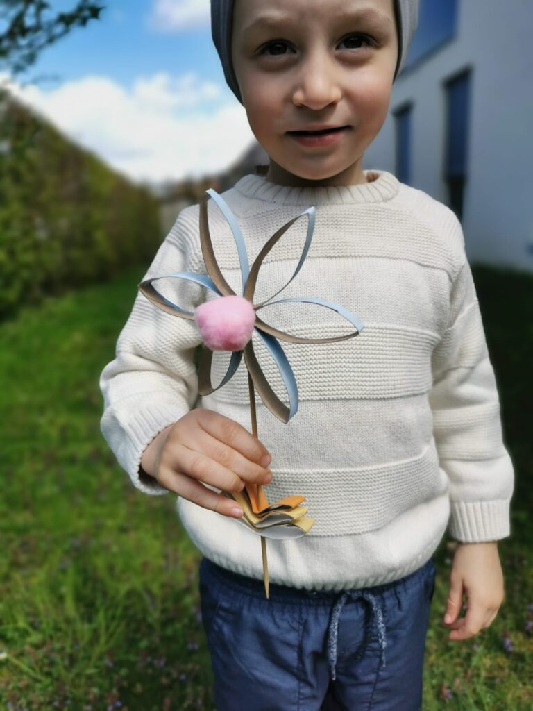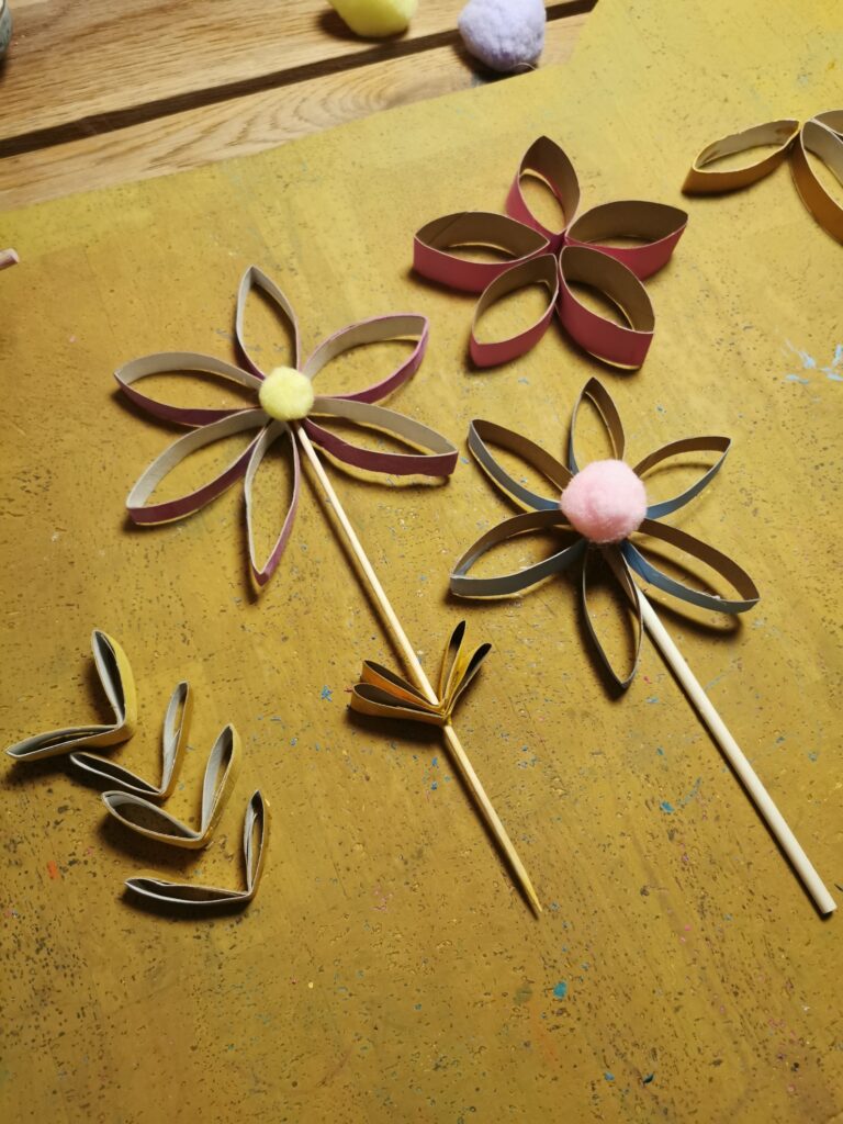Wer möchte, kann natürlich auch einzelne Blumen zusammenkleben und auf einem Stäbchen befestigen, wie im Bild. Das ist zum Beispiel ein süßer Topfschmuck für Topfpflanzen. Oder du könntest die einzelnen Blumen mit einem Faden verbinden, sodass eine Art „Hängegirlande“ entsteht.