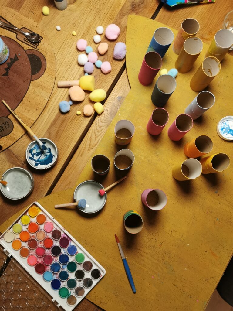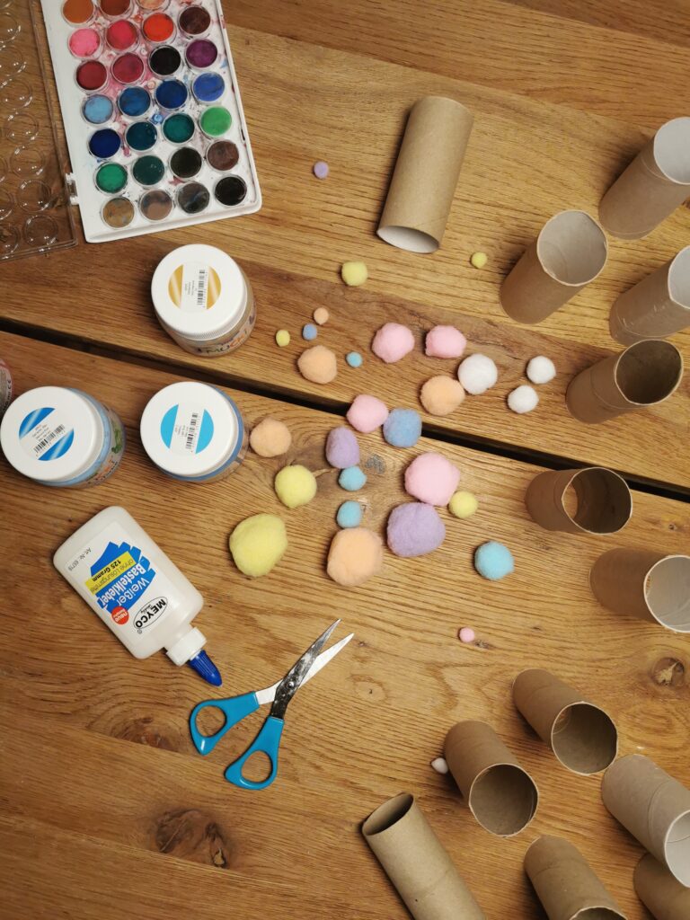 Zuerst malst du die Klorollen in deinen Lieblingsfarben bunt an. Du kannst sie einfärbig bemalen oder ihnen Muster schenken. Sei kreativ!